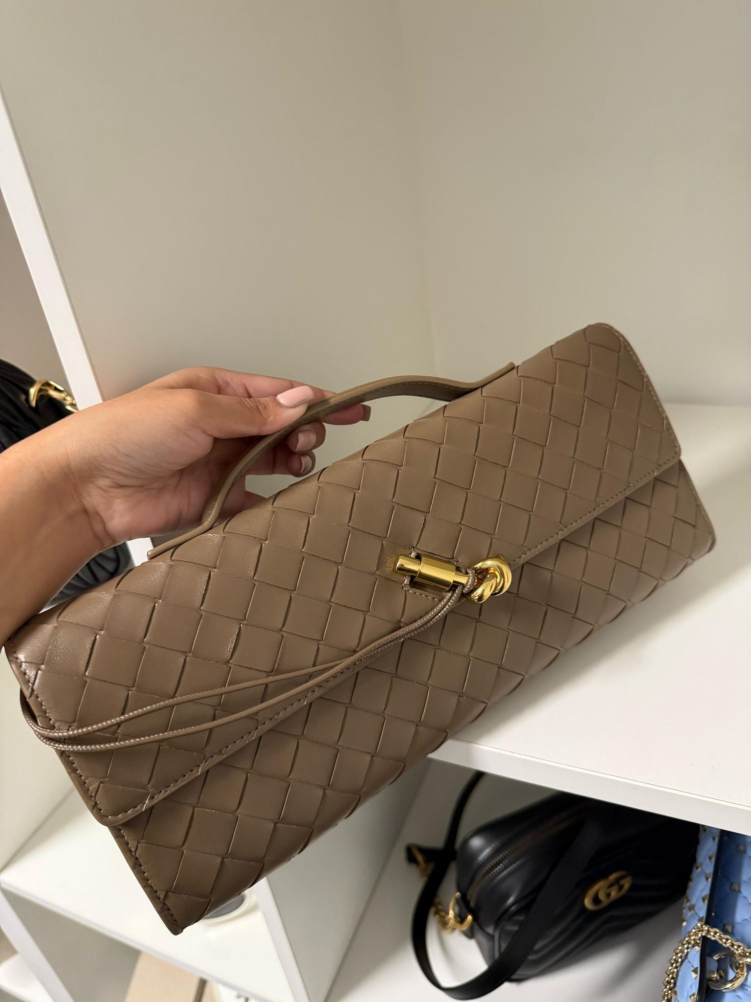 The Andiamo clutch from Bottega Veneta is crafted with expert precision and attention to detail, resulting in a timeless and refined accessory. Made with the highest quality materials, this clutch exudes luxury and sophistication, making it the perfect choice for any formal occasion. Upgrade your accessory game with the Andiamo clutch.
