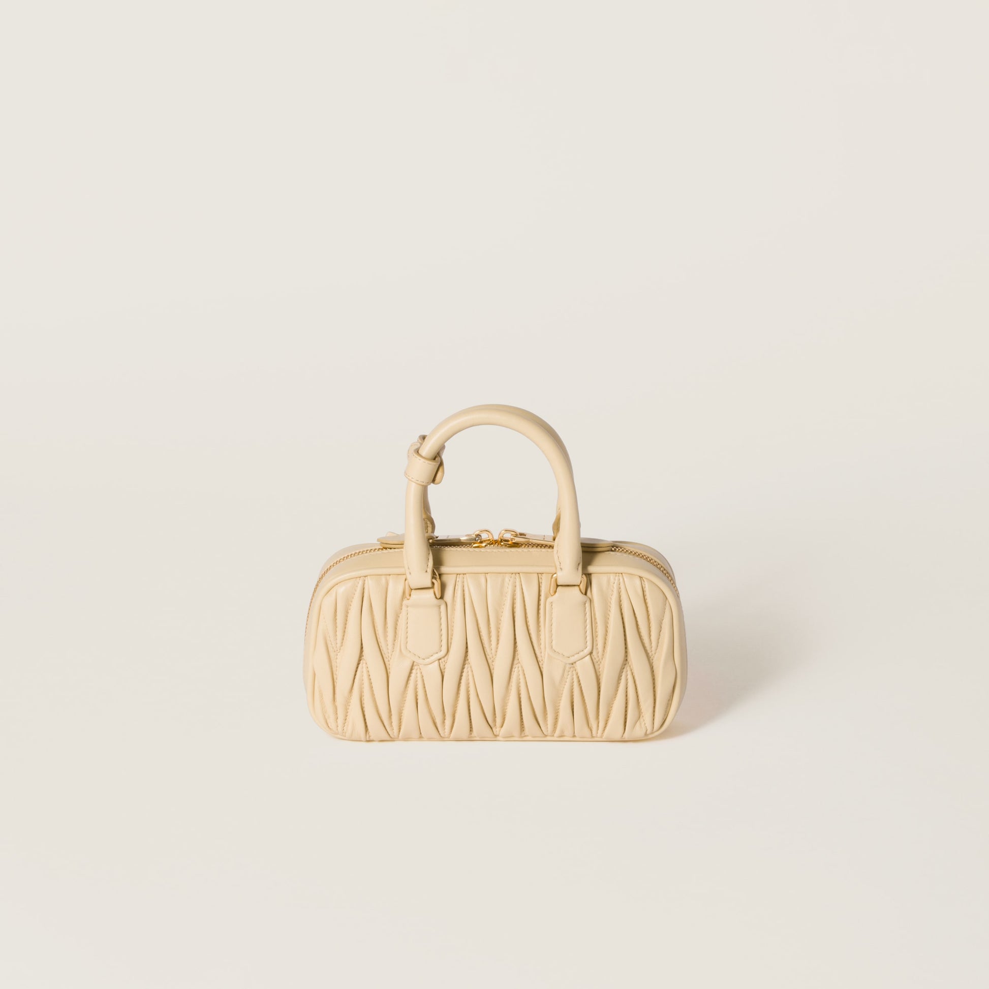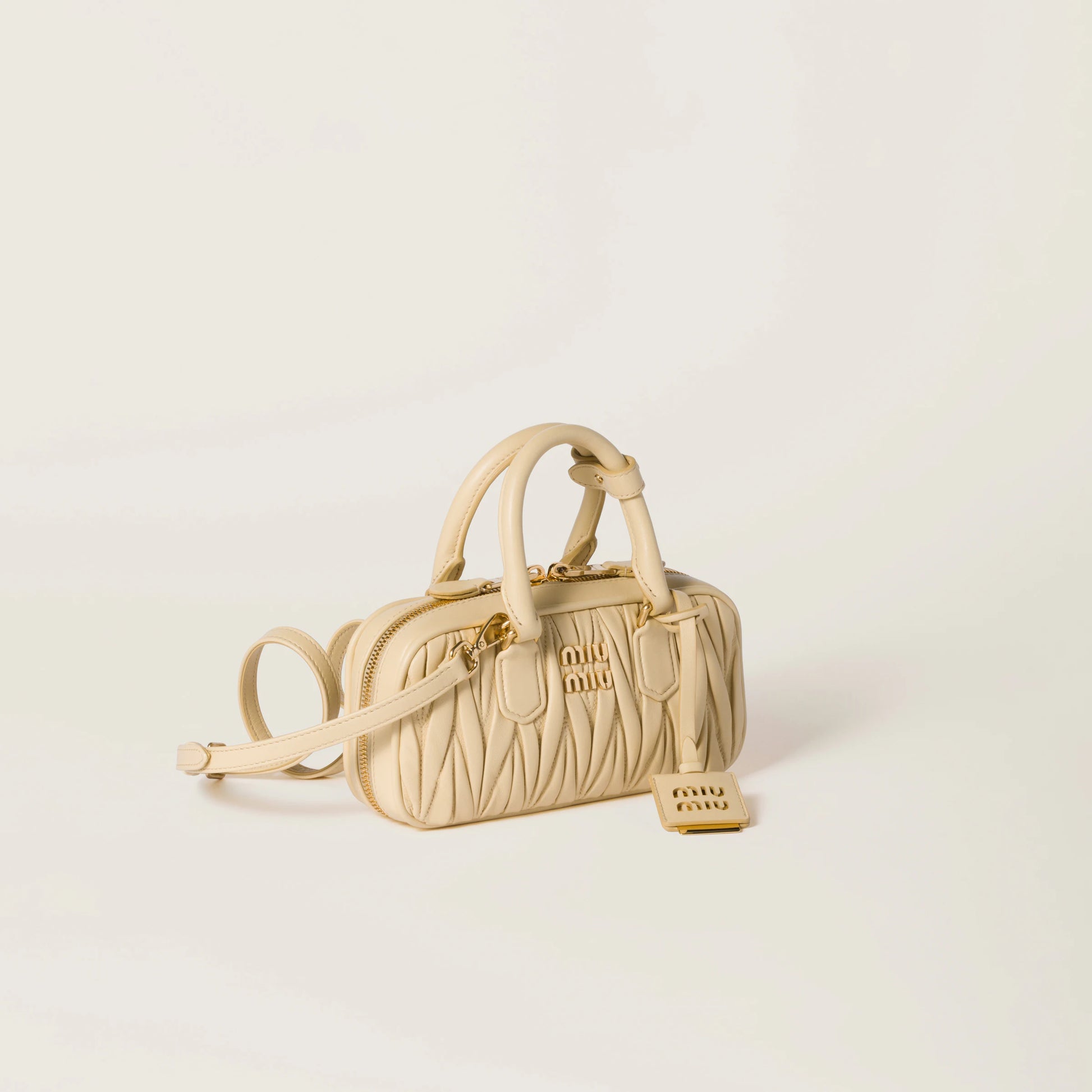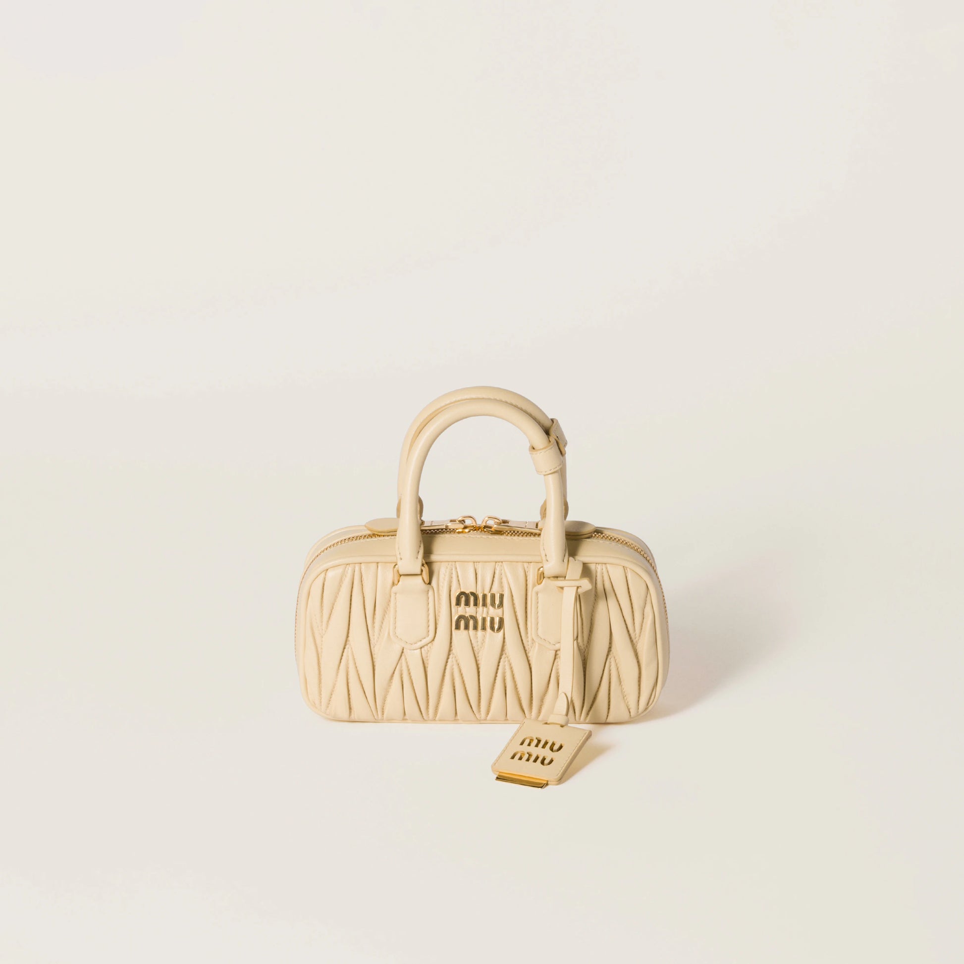Fine matelassé workmanship reinterprets the classic silhouette of the top-handle bag, giving it a three-dimensional, textured, and extremely sophisticated effect. The lettering logo on the front, which echoes the finish of the metal hardware, stands out against the refined artisan workmanship with an iconic and immediately recognizable touch. The dynamic and elegant lines of this mini format and the detachable, adjustable shoulder strap contribute to the versatile, functional, and modern design of the bag.