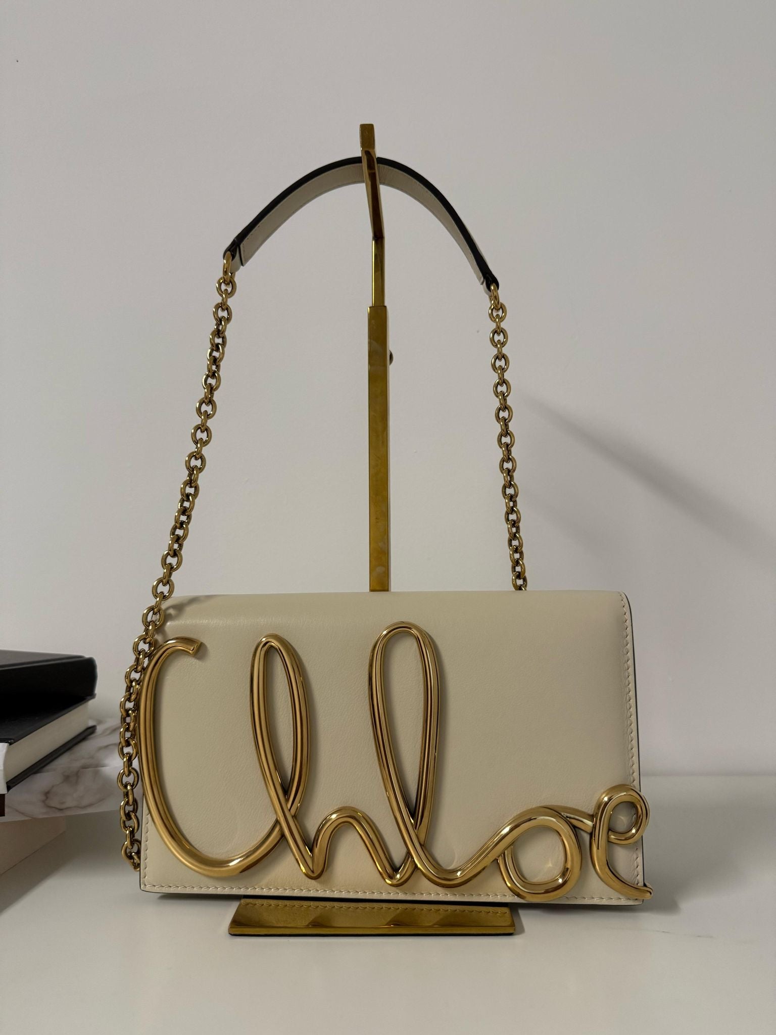 Crafted from smooth calfskin, the Chloé Iconic crossbody bag is inspired by a belt from the Maison's Archives, featuring an oversized golden jewel-like signature.